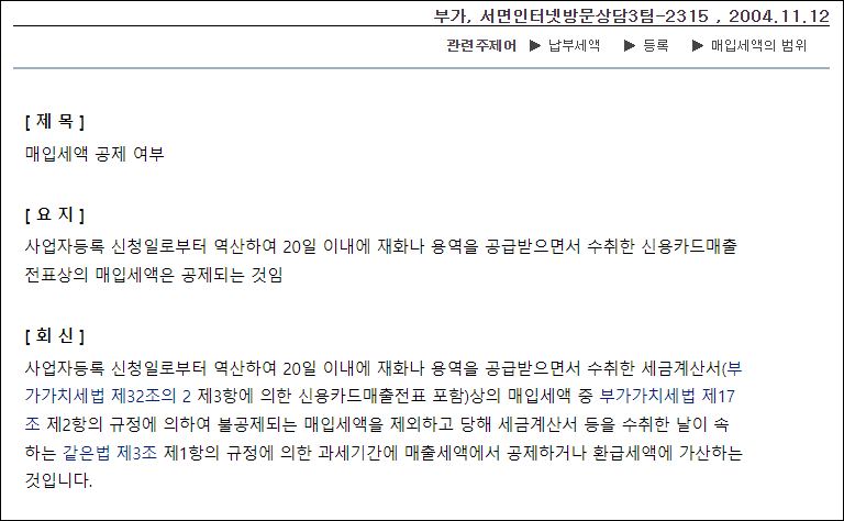 공급시기가 속하는 과세기간이 끝난 후 20일 이내에 사업자등록신청을 하면 등록신청일로부터 공급시기가 속하는 과세기간 기산일 까지 연산한 기간 내의 것은 매입세액공제를 받을 수 있다.